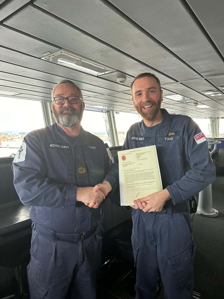 In all, Alfie made three trips between HMS Diamond and the yacht either to ferry the latter’s crew to safety or deliver specialists and equipment, remaining on hand until the last safe moment to return to his ship, all the while providing reassurance to his shipmates.
