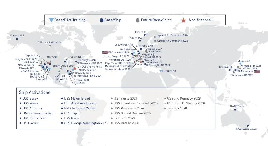 As of early January, the F-35 program has amassed over 773,000 flying hours, trained over 2,280 pilots and 15,400 maintainers across 14 flying services around the world, and flown more than 469,000 total sorties. There are now 32 bases and 11 ships hosting or capable of hosting F-35 units.