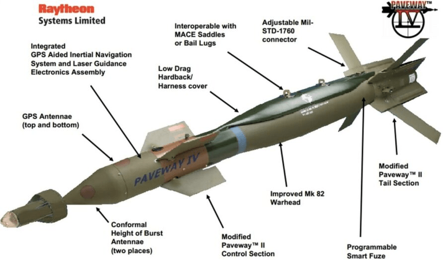 This weeks strikes on the Houthi’s in Yemen by the RAF Typhoons took out a number of targets using the Paveway IV guided bombs that weigh in at 226kg with a 45kg warhead in the middle which can penetrate the concrete, and a tail section that guides the bomb. It also uses a smart fuse to control how the bomb is detonated.