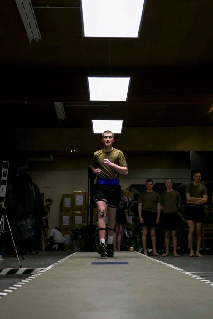 Markers – reference points – were fitted to a recruit’s body before they walked/ran down a short runway, filmed all the way, while pressure sensors under the walkway recorded the distribution and application of weight.